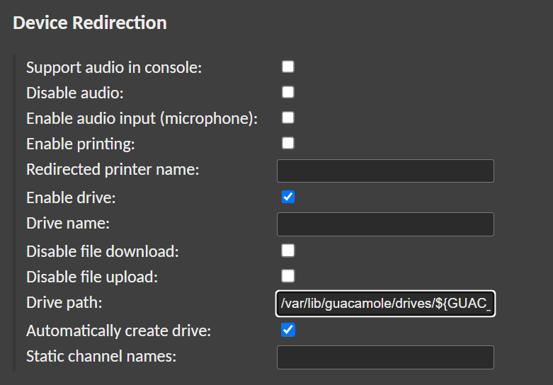 Next, enable filesharing on a connection basis using the connection settings. To create a unique shared drive per user set the Drive path to /var/lib/guacamole/drives/${GUAC_USERNAME} in the connection settings. With this setup any uploaded file is automatically shared with all VMs the user has access to. To reveal the file upload menu press ctrl + alt + shift.