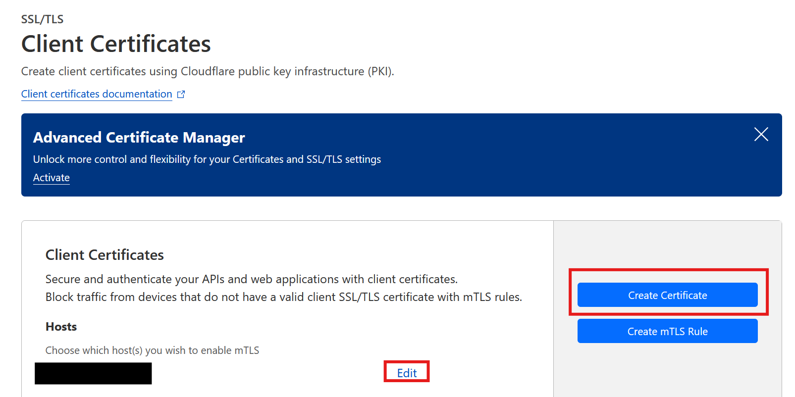 Store the key in a file named cf-[username].key.pem and the certificate in a file named cf-[username].cert.pem. You’ll need these later to import the certificate in your browser. Before you continue, click on the edit link to add the public host (eg. guac.[YOUR_DOMAIN].com) you created before to the list of mTLS enabled domains: