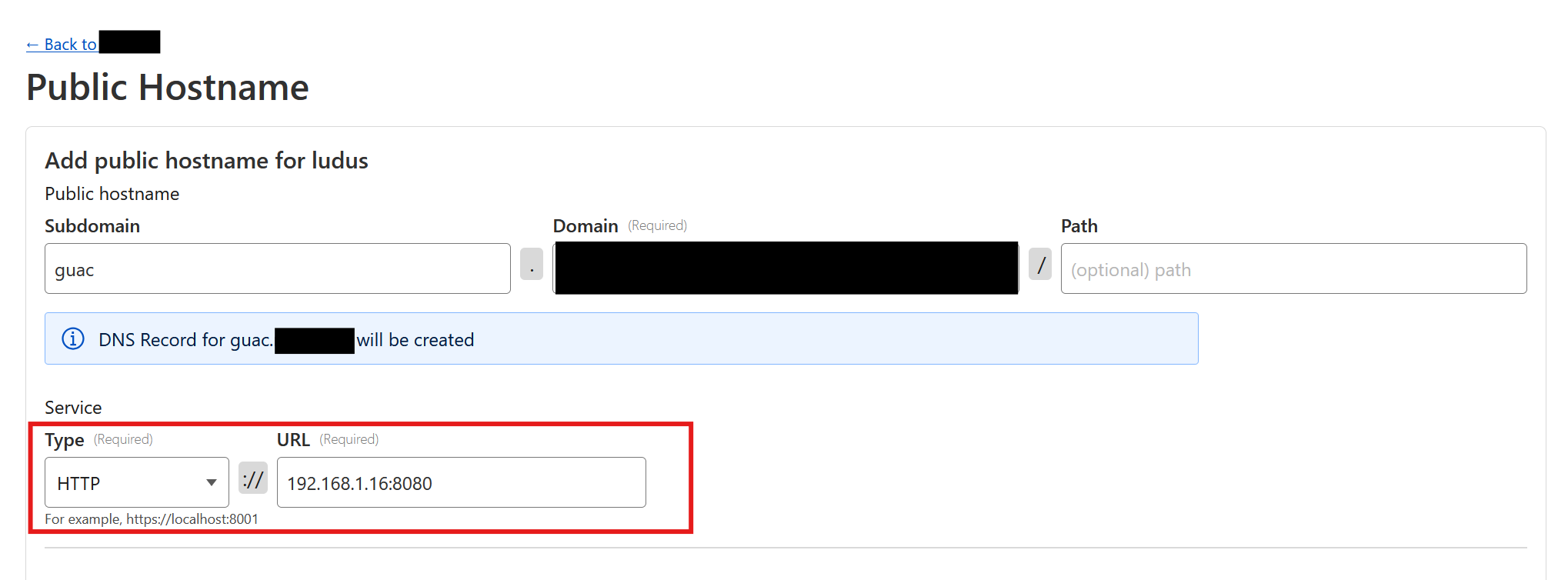 To expose guacamole you must add a public hostname to your tunnel. Choose a suitable subdomain (eg. guac) and then set the service type to HTTP and insert the internal IP address of your guac host followed by a colon and the port 8080 (eg. 192.168.1.16:8080). Cloudflare will only make your host available over HTTPS, so no need to worry about that!