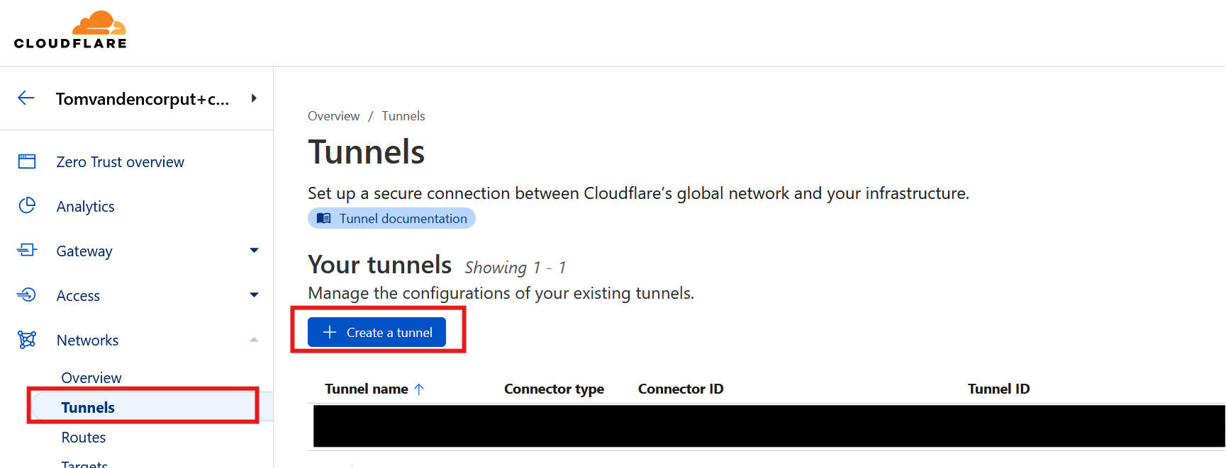 Let’s use CloudFlare tunnels to make the guac host available from anywhere. To start, login to your cloudflare account and look for tunnels (use the search feature). Then create a new tunnel, and as the type select cloudflared and give it a memorable name (eg. ludus).