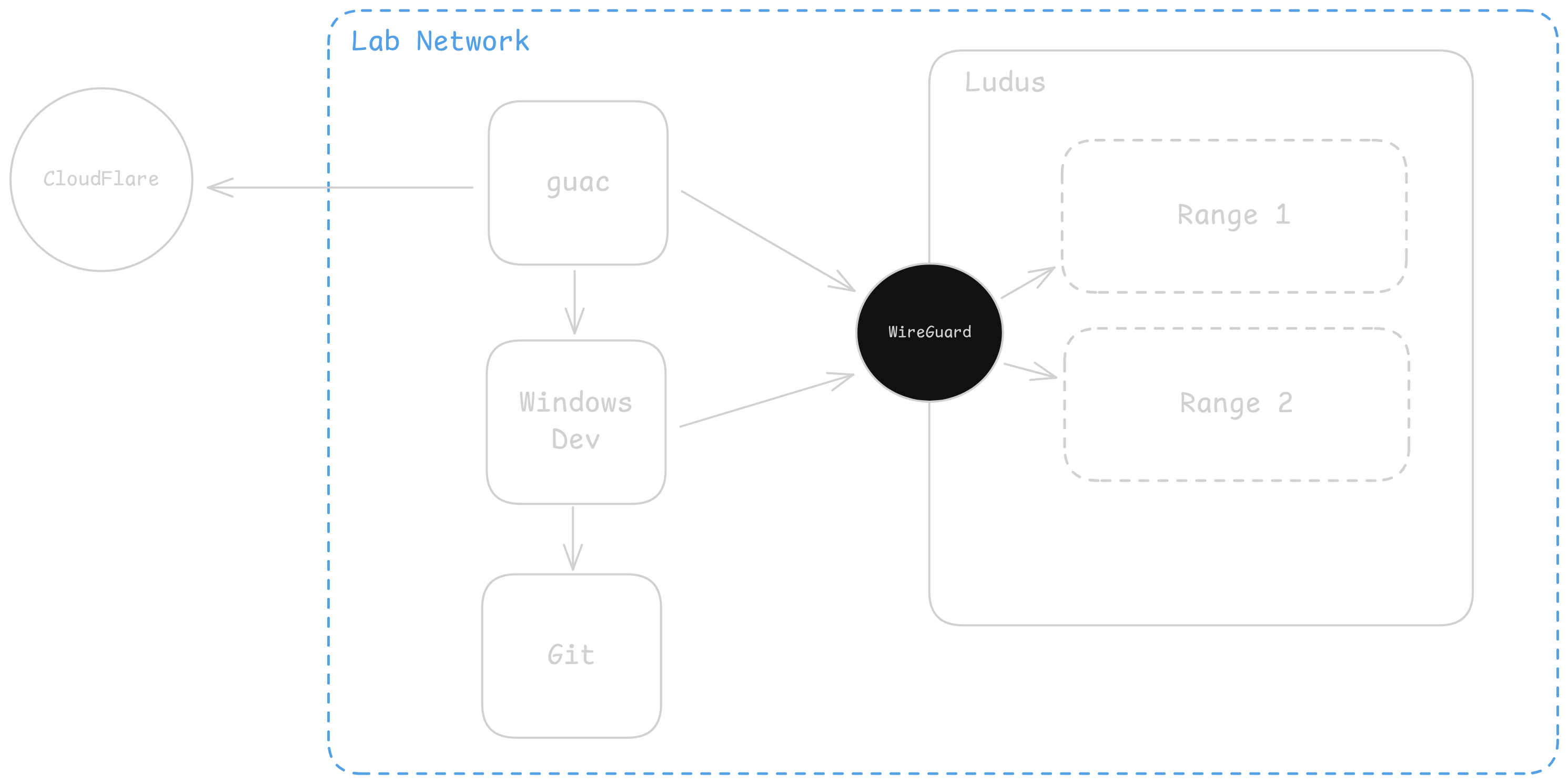 Therefore, I looked into making my Ludus ranges available remotely. I strongly dislike opening up any ports on my home network, and I am not always able to have outbound VPN traffic. Reading up on what other homelabbers have done, I opted to expose Ludus using CloudFlare tunnels. This means you have a trust relationship with CloudFlare.