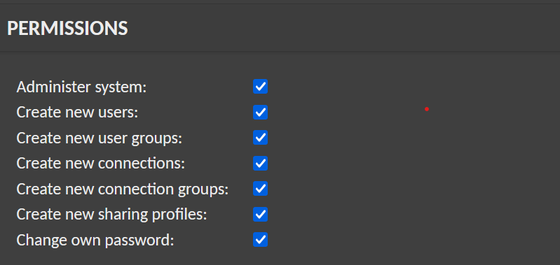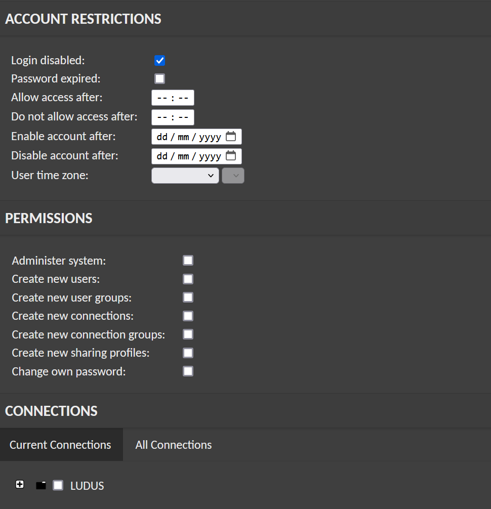 Now logout and login with the new user. Go back to the user settings and select the guacadmin user, and under Account Restrictions set the Login disabled flag. For good measure, you may also want to remove all permissions in the permissions and connections sections: