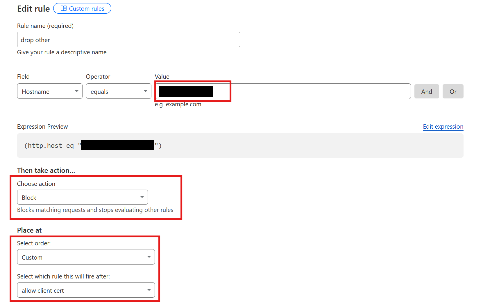 Now, we must configure the WAF to only allow mTLS authenticated inbound connections to your public host. Go to your website dashboard and then select Security > WAF in the left-hand menu. Then go to custom rules and create two rules.