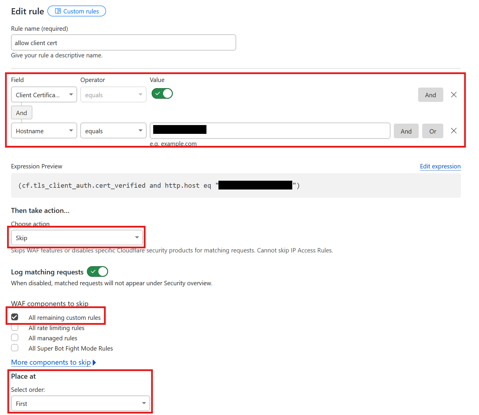 The first rule is to match any mTLS authenticated connection and set its action to skip: